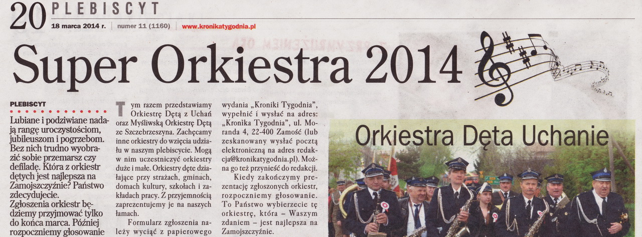 PLEBISCYT KRONIKI TYGODNIA NA NAJLEPSZĄ ORKIESTRĘ DĘTA NA ZAMOJSZCZYŹNIE. Orkiestra Dęta z Uchań zgłoszona została do plebiscytu organizowanego przez zamojską Kronikę Tygodnia pt. "SUPER ORKIESTRA 2014". Głosować na naszą Orkiestrę można poprzez dostarczenie do redakcji Kroniki Tygodnia wypełnionych kuponów drukowanych w bieżących numerach gazety za pośrednictwem poczty polskiej, zeskanować i wysłać pocztą elektroniczną lub przynieść osobiście do redakcji. Prezentacja Orkiestry Dętej z Uchań odbyła się na łamach gazety Kronika Tygodnia, numer 11, str.20. ZAPRASZAMY I ZACHĘCAMY BARDZO SERDECZNIE do głosowania na Naszą jedyną Orkiestrę Dętą w powiecie.